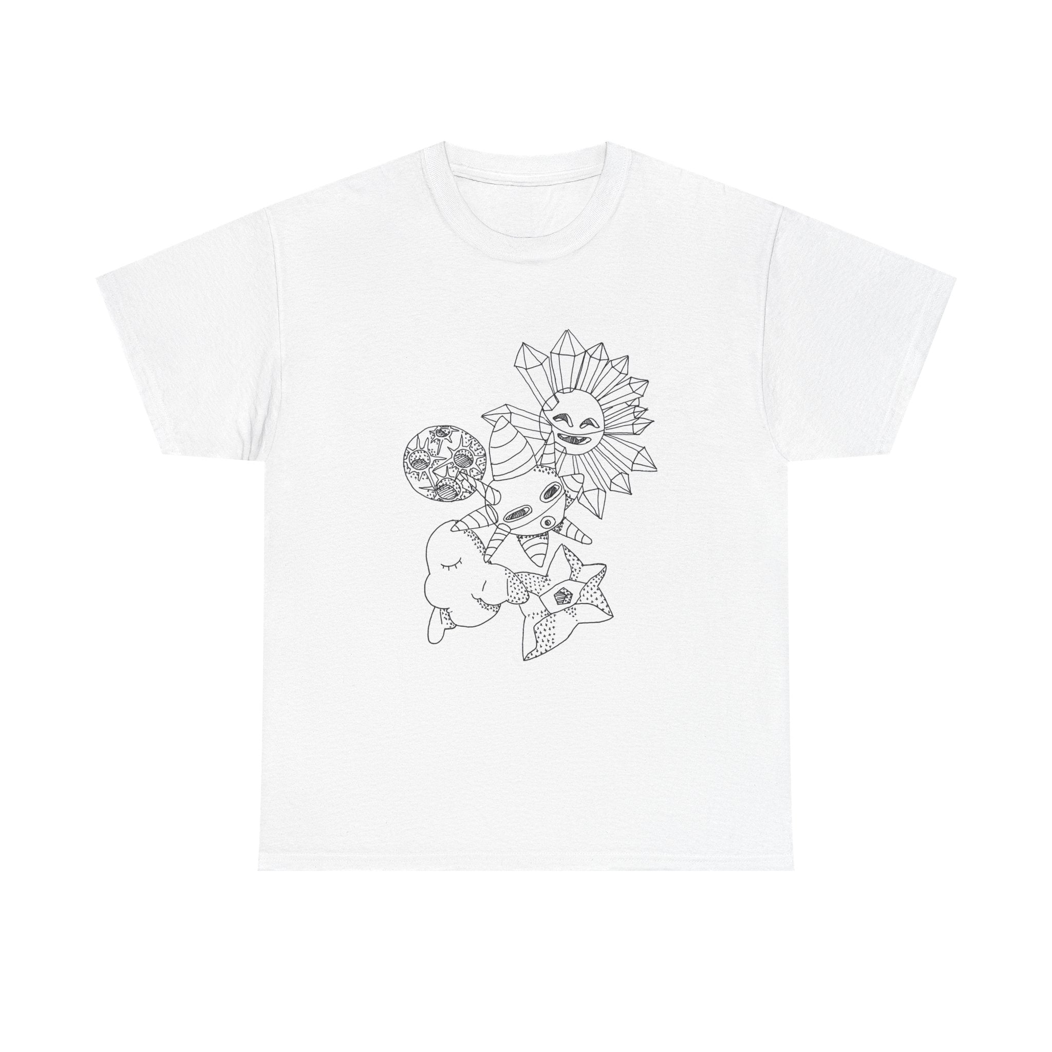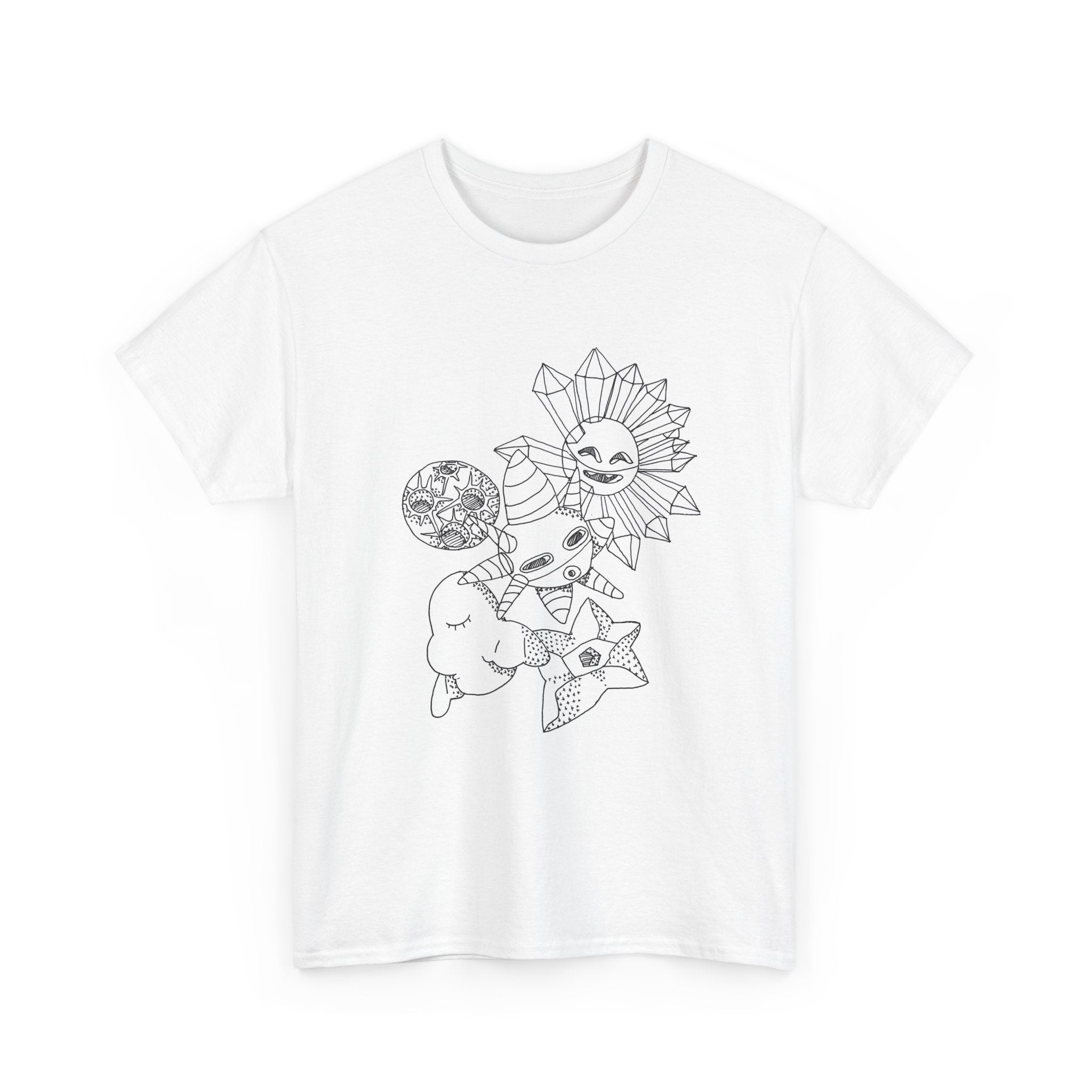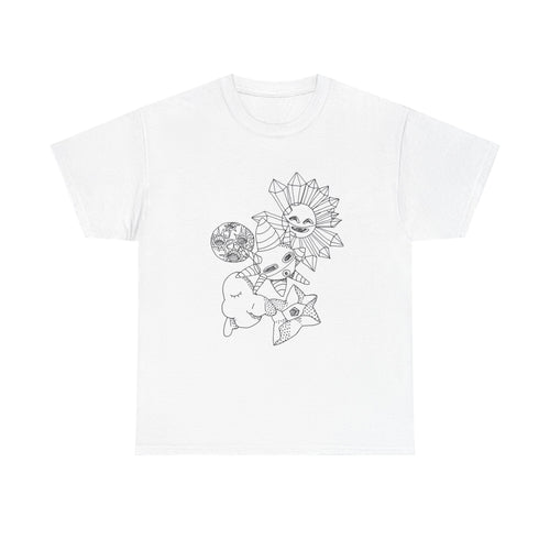 Celestial Doodles Graphic Tee — Sun, Moon & Stars Line Art T-Shirt